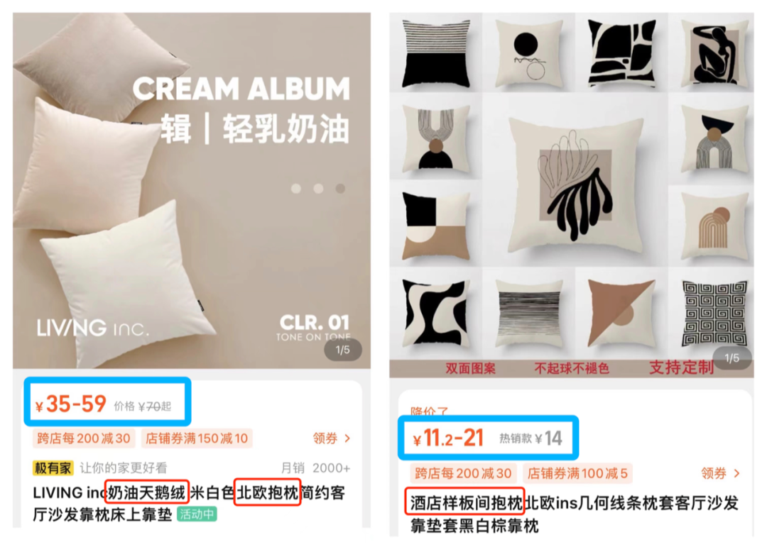 放眼“抱枕”搜索区,满是北欧、天鹅绒、奶油色系等形容词包装后的产物,甚至有些抱枕以布料抗菌为卖点进行宣传。