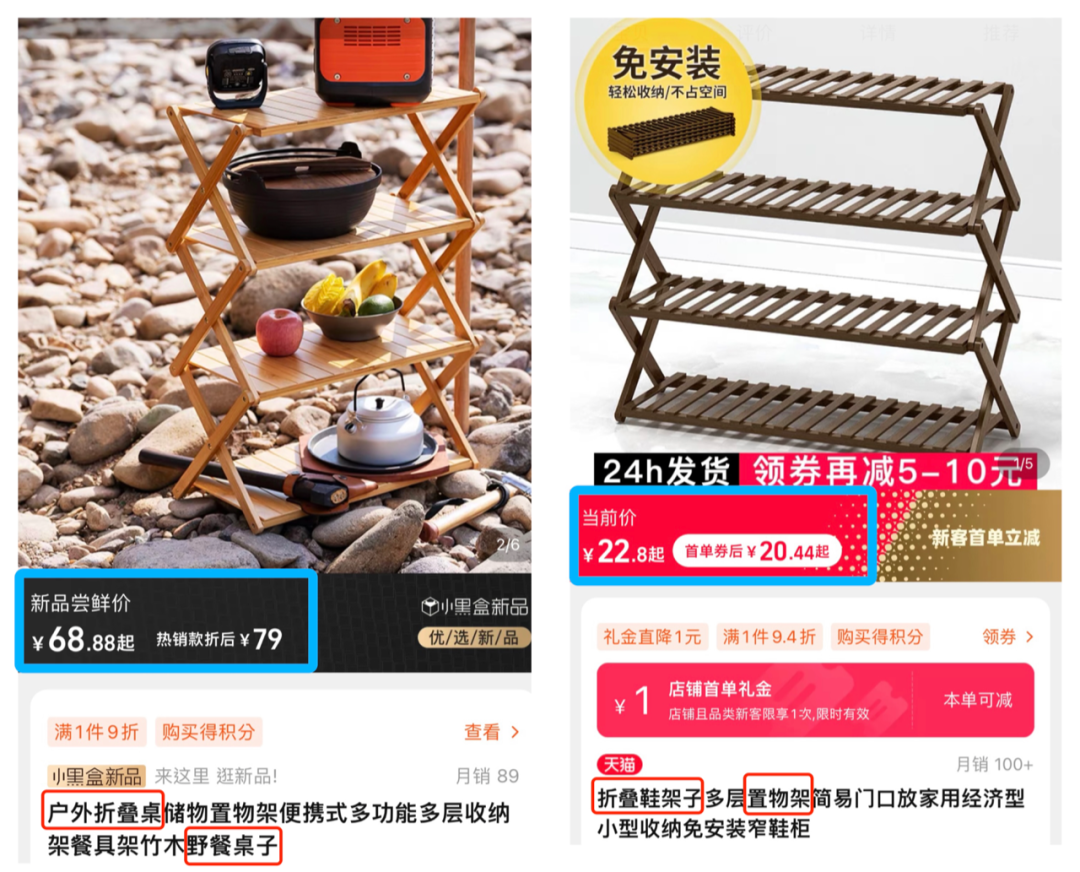 食材、器具、生活用品……露营用品繁多,总有桌子塞不下的时候,置物架的存在就格外关键。但露营置物架的价格,却比和它长得相似、作用一致的折叠鞋架,高出太多。