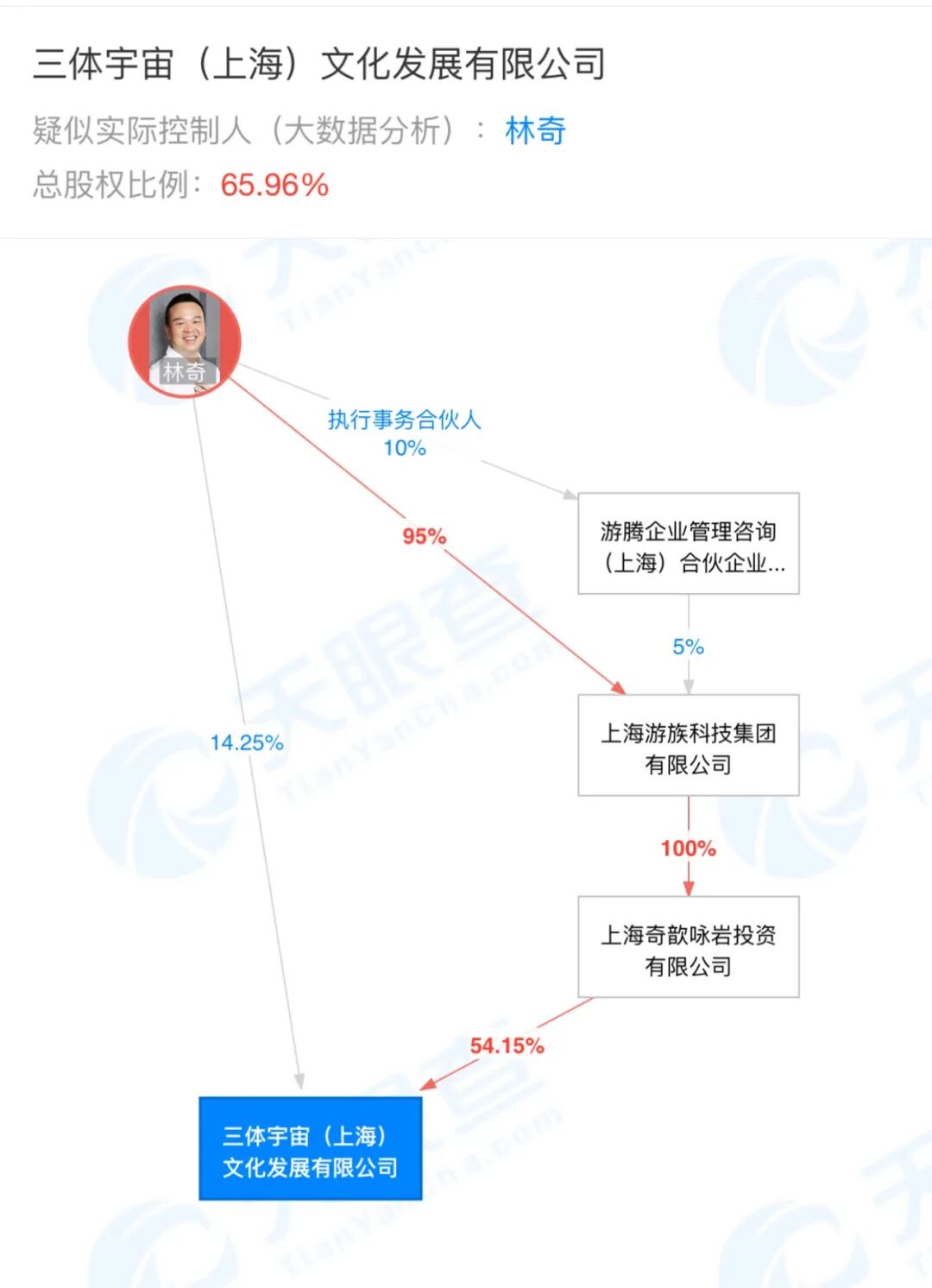 直至游族终于从张番番手里买下了《三体》原著版权,“三体宇宙”才变得名副其实。2018年12月,在林奇的受命下,许垚成立三体宇宙(上海)文化发展公司并担任CEO,林奇实际收益股份占65.96%,为实质控股人。