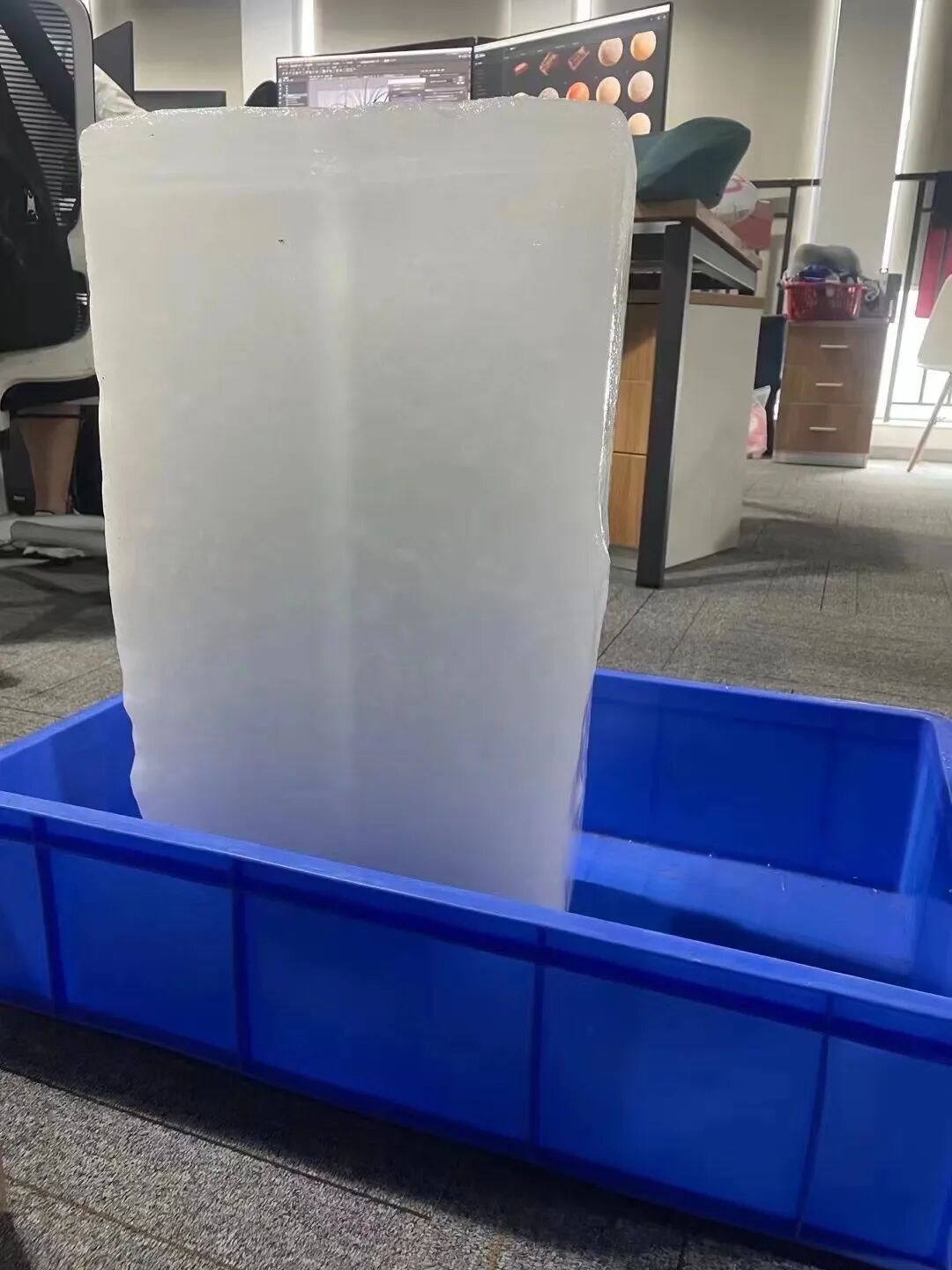 当金萧雨和同事们推着蓝色小拖车,把20条冰块运进工位时,安静的办公室爆发出一阵兴奋的骚动。几名穿着短T恤、大裤衩的男士围上来想帮忙,其他人的眼神则紧跟着80斤重的大冰块移动。
