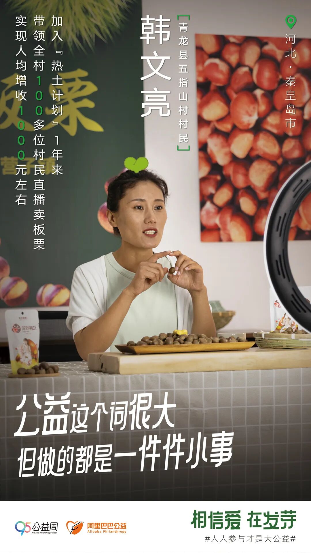 一个偶然的机会,韩文亮认识了阿里巴巴公益的乡村特派员刘琳,她叫她琳姐。当时琳姐在青龙县各乡镇做调研,寻找地方农业合作社做电商的可能性。接触刘琳之前,韩文亮在淘宝上开了村里唯一一家板栗淘宝店,生意不温不火,那时村里人并不知道什么是电商,更别说直播。