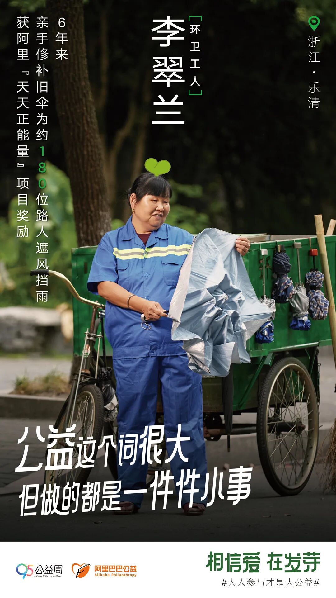 这些普通人努力生活、帮助别人的同时,更多助力也正在向他们涌来。在阿里乡村特派员刘琳的帮助下,韩文亮村子里的女人们经济独立,青龙板栗的知名度越来越高,成为了“盒马”供应商,“日子过得越来越好,大家积极性越来越高”,刘琳还被当地称为“板栗格格”。环卫工李翠兰成为了阿里巴巴“正能量合伙人”,还收到了来自阿里“天天正能量”的特别奖5000元。作为“公益宝贝计划”所合作项目的一线工作者,罗应凤陪伴的孩子越来越多,现在这个数字是“1755”。