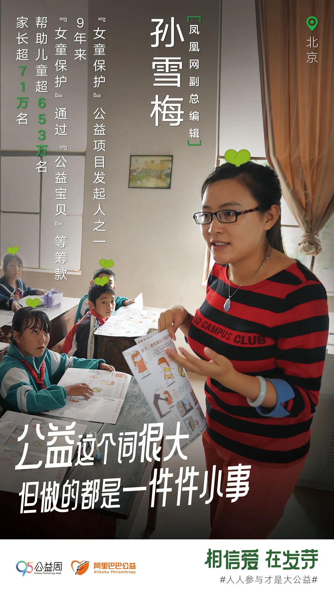 这些普通人的力量,孙雪梅在接近十年的时间里,见证了许多。作为凤凰网副总编辑、全国政务中心总经理、“女童保护”公益项目发起人之一,孙雪梅从2013年发起“女童保护”项目以来,团队由最初的百名女记者,发展到现在上万人的公益讲师团队。