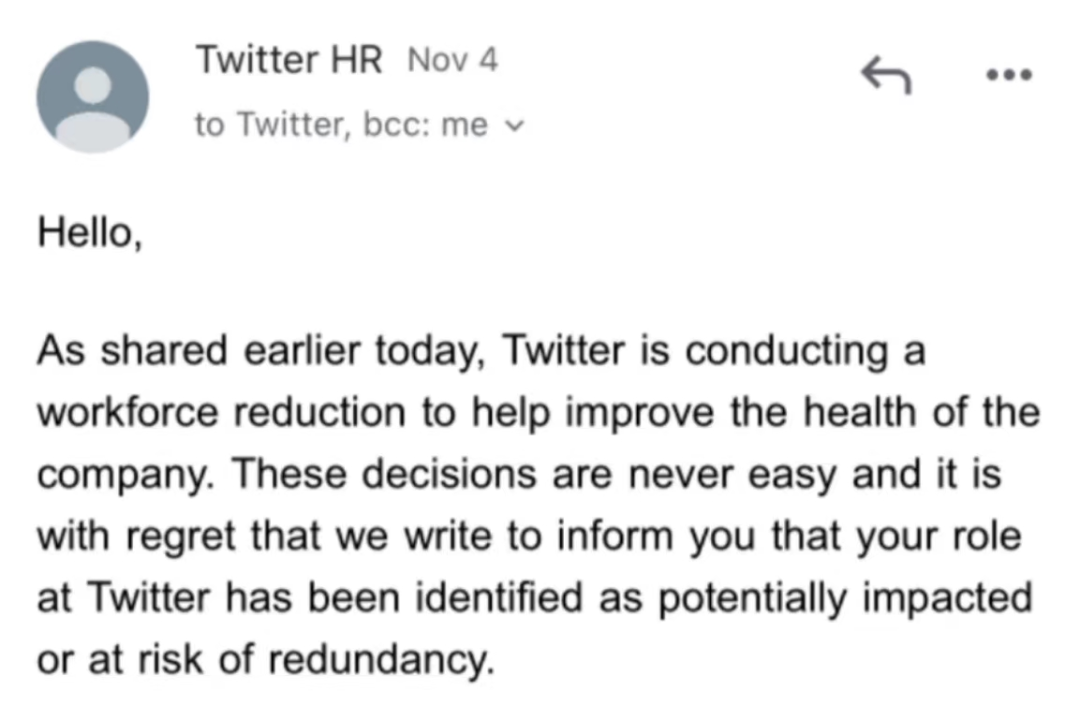 弗兰克终于松了一口气。在周四晚,所有推特员工都收到的那封裁员预告说道,接下来所有员工会再收到一个邮件,如果工作没有受到影响,那么将是通过公司邮件接收;如果工作受到了影响,则是通过个人电子邮件接收。至于裁员的理由,邮件说是“旨在让公司走上健康的发展道路”。