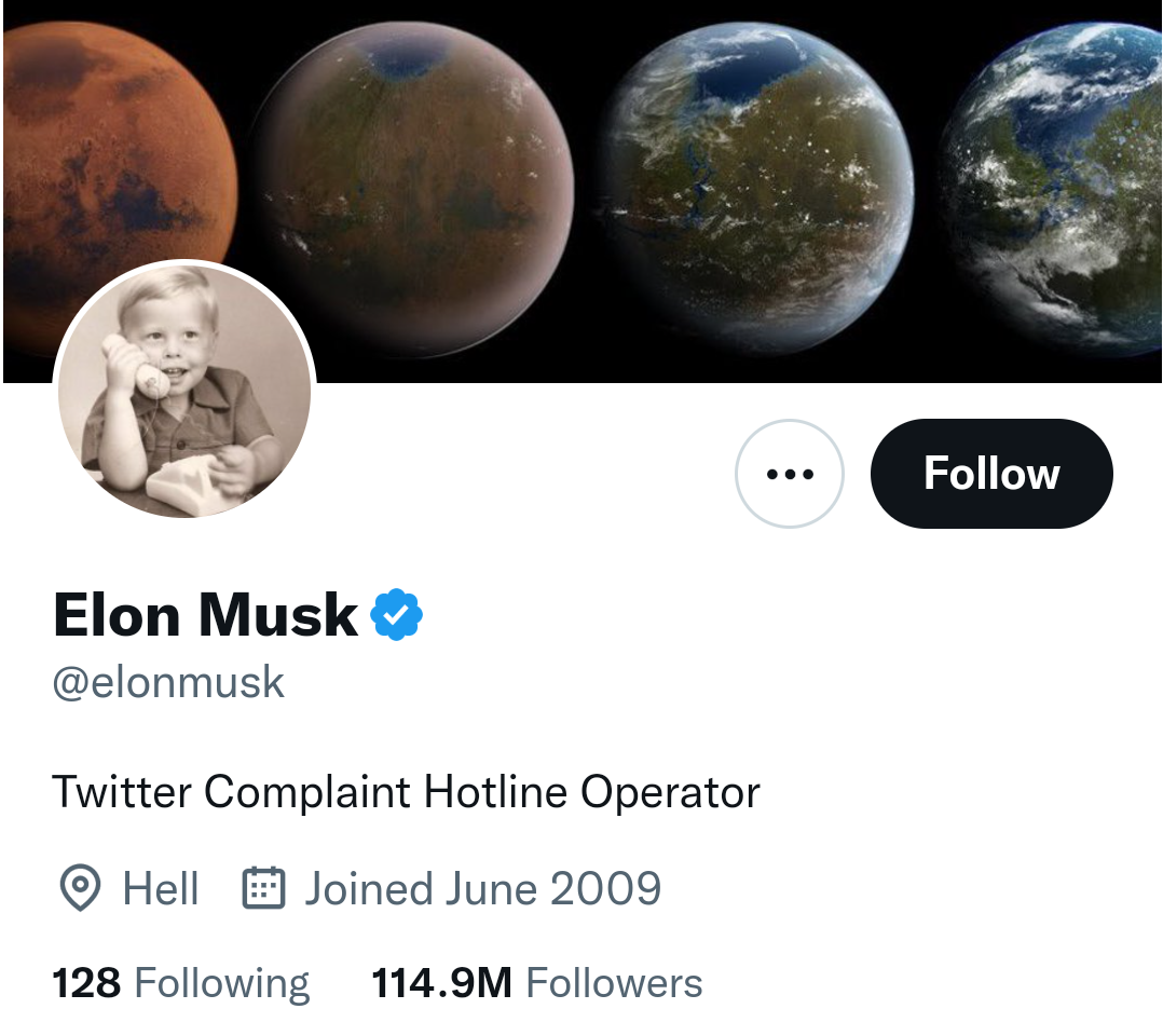 ▲ 11月8日,马斯克的推特账号,定位在“地狱”,简介为“推特投诉热线接线员”。图 / 推特