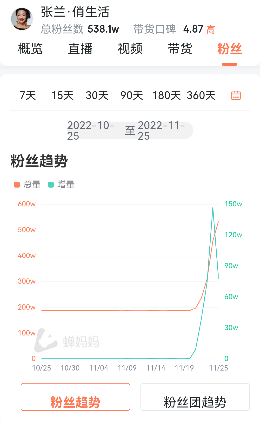 ▲ “张兰·俏生活”直播间近一个月粉丝增长曲线。图 / 蝉妈妈截图