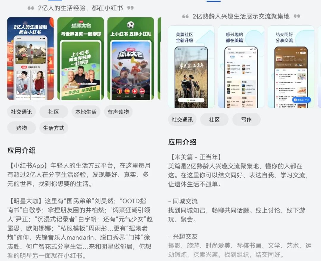 ▲ 在手机应用商城,小红书(左)和美篇(右)的定位有所区分。图 / 应用商城