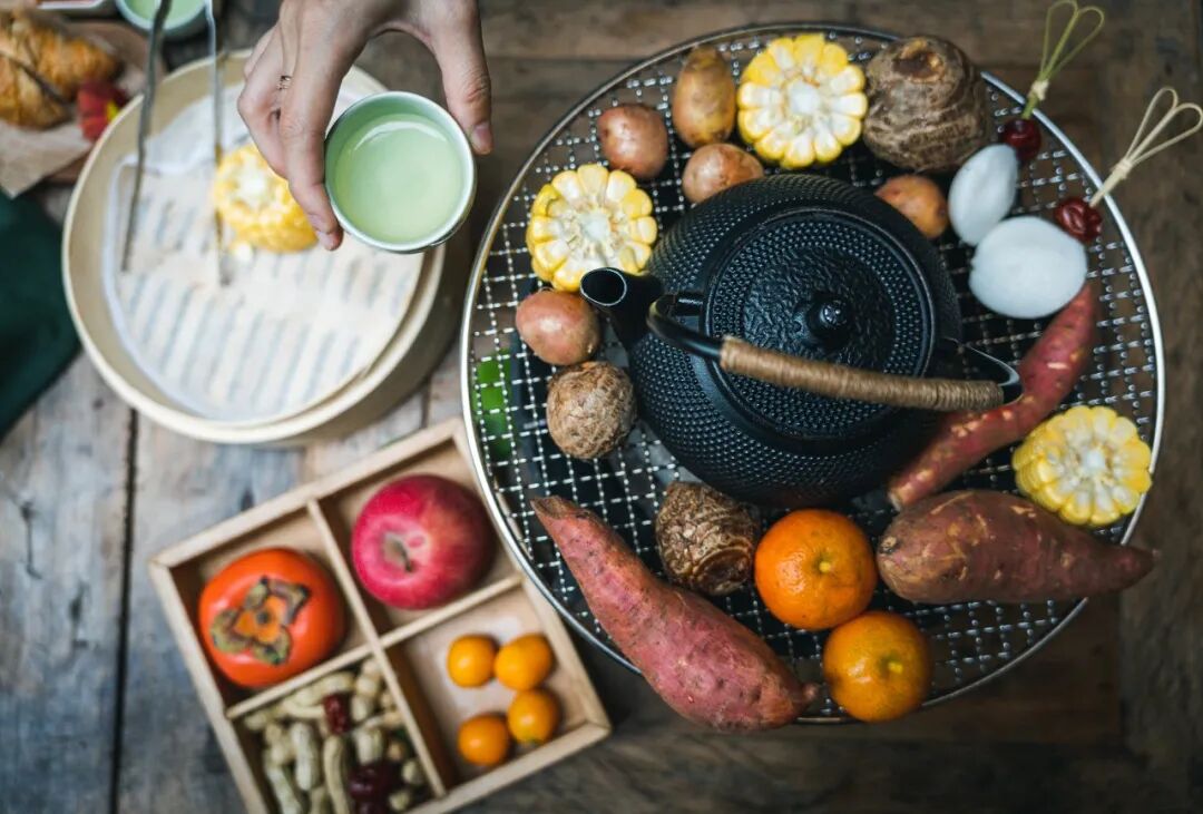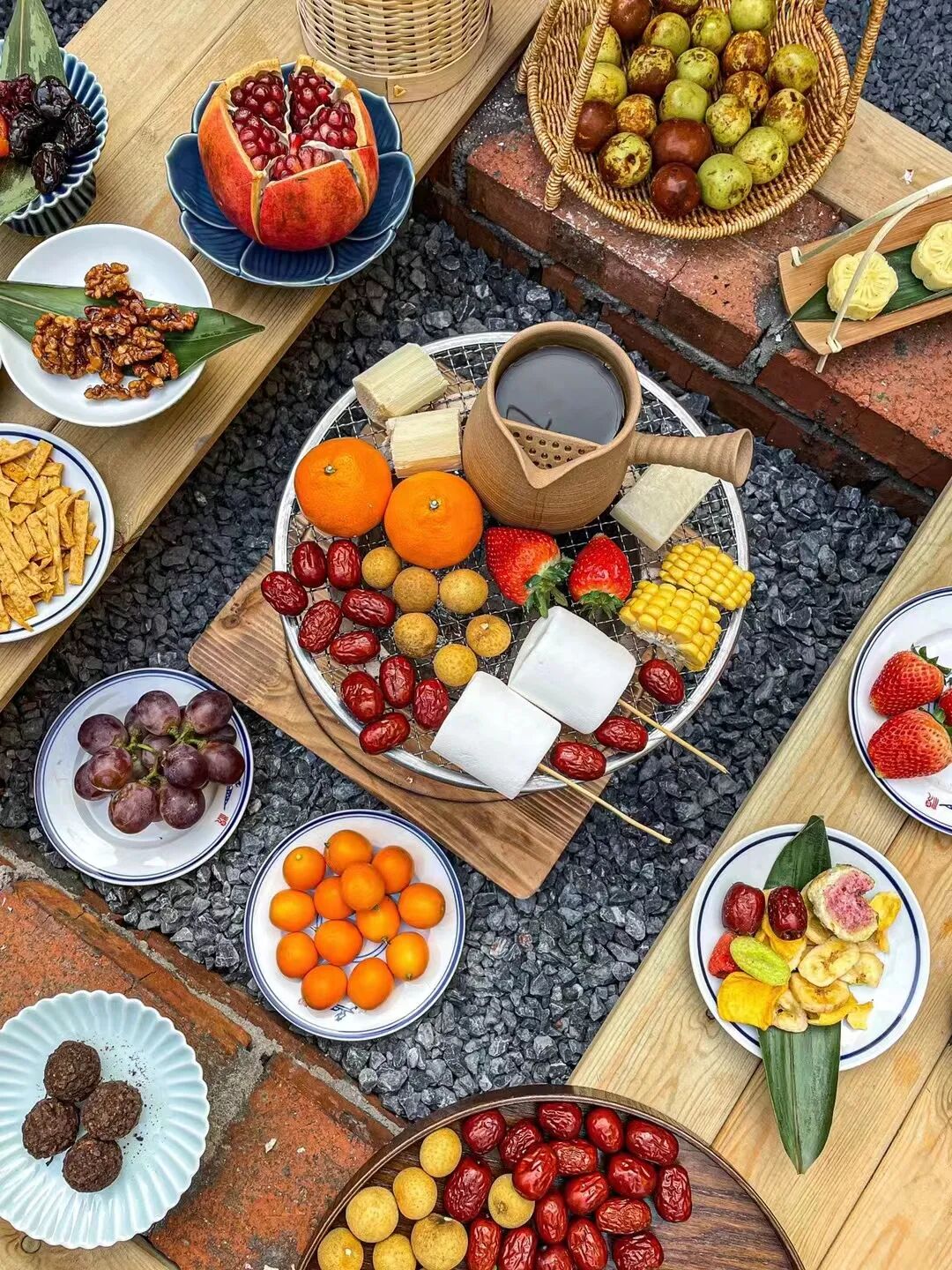 露天小院,古朴木桌,桌子上是泥炉,泥炉上落着茶壶,周围摆放着红薯、花生、柿子、红枣,还有盛着中式糕点的彩色陶瓷盘,以及放在竹编篮子里的新鲜水果。