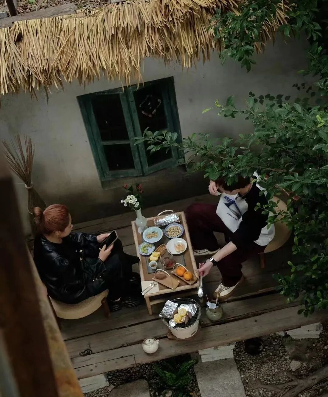 为了出片,衣服也得呼应,浙江余姚的吴荔枝,就特地穿一件宋制汉服去围炉煮茶,半披长发用发卡束着,“穿的古风一点,跟场景更符合”。好些中式茶馆都为年轻人提供了充分的创作空间,特意在院子里搭了稻草棚,用红砖水泥围了茶台,还准备了纱帐灯笼墙和油纸伞、大葵扇这样的拍照道具。