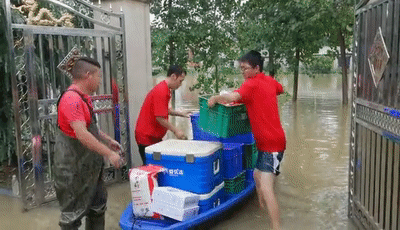 ▲ 员工们冒大雨用小船送货。图 / 兴盛优选公众号