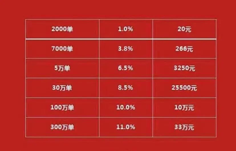 2017年,兴盛优选开始向外拓展。14个初代团长需要去发展新团长,每人下面最多只能放9条下线。多出来的人,就继续往下线下面放。一个团长名下的所有下线,都是属于他的小团队,团队累积单量决定了团长每月能获得的奖金。在社区团购的语境中,单量就是顾客购买商品的数量,一个顾客购买了10样东西,就算10单。一名团长和他名下所有下线的总单量如果达到每月2000单,他的团队就一共能获得20元。7000单,266元。5万单,3250元。到了300万单,单月就能获得33万元。