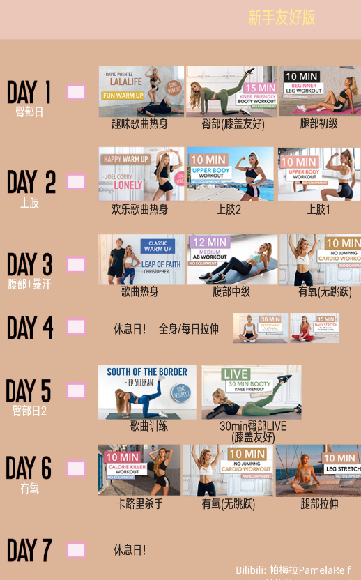 ▲ 帕梅拉在中文社交平台为粉丝们设计的训练日程表。图 / 微博截图