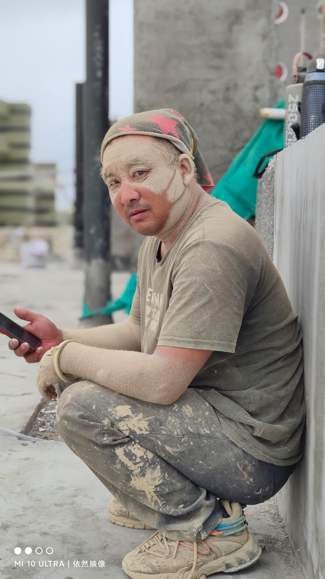 刘刚拍的是他的工友,他们已经共事了快6年。拍照的时候,两人刚刚下班,正蹲着等电梯。工友的口罩摘下来,露出干净的下半张脸,像极了一张面具。其实,在平日里,工友们都不喜欢被刘刚拍,理由是“太脏了,不想拍”。