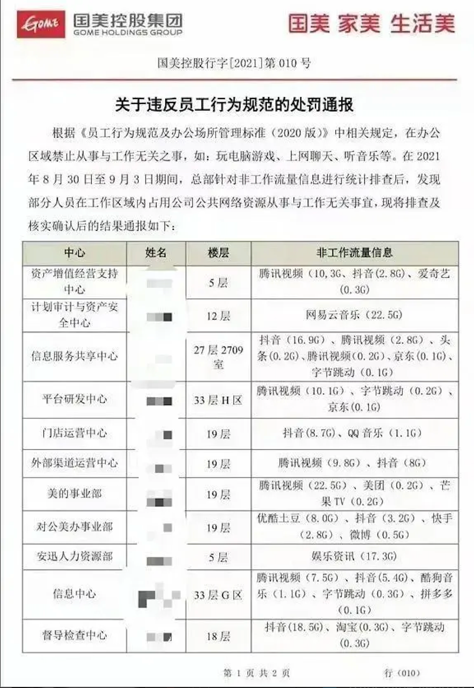 2021年11月16日,国美内部一份《关于违反员工行为规范的处罚通报》流出,显示出国美对员工在工作期间的流量监控,谁刷了抖音,谁听了音乐,用了多少流量,一目了然。“我们手机都不敢连公司的WiFi,电脑上也不敢登自己的微信,工作之外的任何事情都不能聊,否则就把你查出来。”
