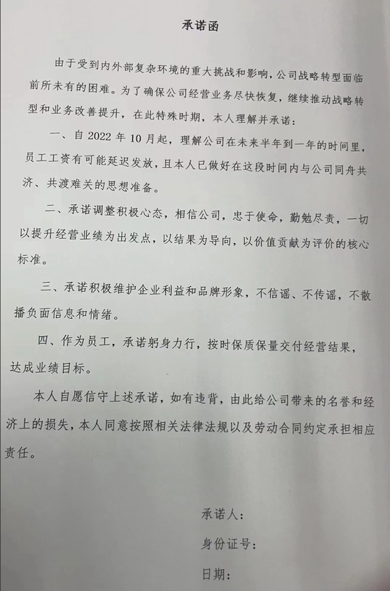 ▲ 国美要求员工签署同意延发工资的承诺书。图 / 网络