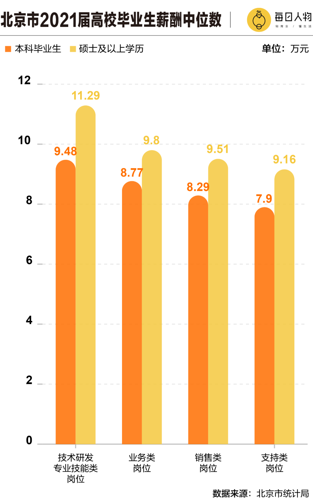 还是以北京为例,2021年,北京市全口径城镇单位就业人员平均工资为10628元,显然“月薪过万遍地都是”。北京市没有权威公布的整体薪酬中位数,不过,同一年的北京市人力资源和社会保障局发布的《北京市人力资源市场薪酬大数据报告》显示,从毕业生的角度来看,本科学历年薪中位值,最高的岗位是技术研发类,年薪是9.48万。最低的是支持类岗位,仅有7.9万元,这类岗位通常指企业的行政、后勤等职能性岗位,很难触及核心业务。一个本科毕业生拿7000元左右的月薪,也符合北京的真实状况。