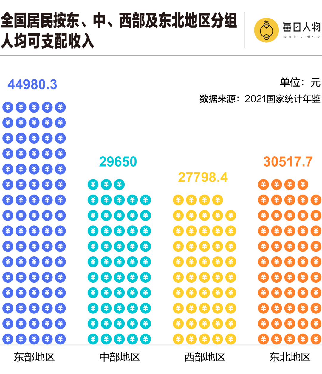 从地域的角度看,东部发达地区的人均可支配收入,与西部欠发达地区相比,差了近两万元,尽管平均月收入的对比中,西藏、宁夏、新疆都表现不错,但从可支配收入的角度看,依然还是与沿海有一定差距。