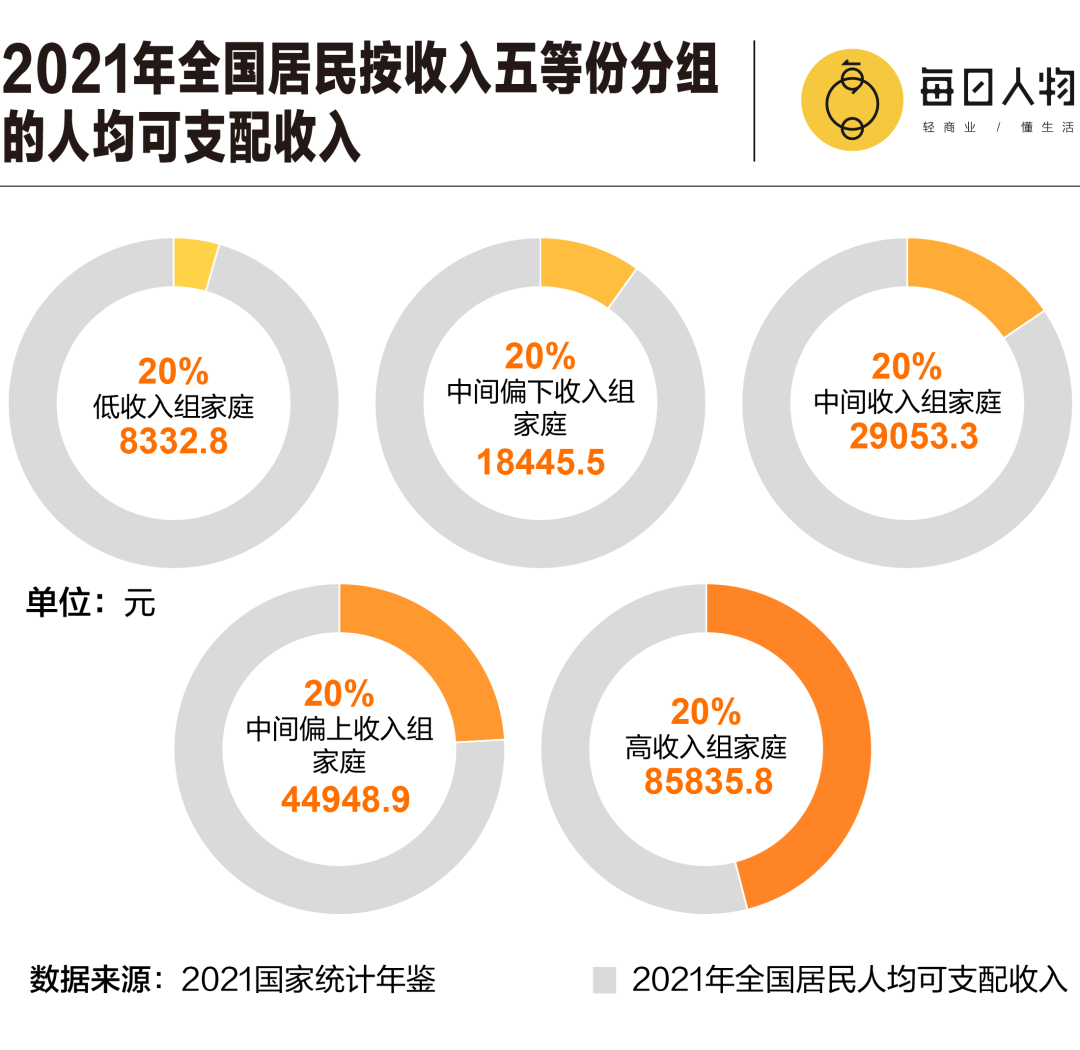 在家庭收入的角度,不同收入水平的家庭,在人均可支配收入一项的差距可以达到近8万元。20%高收入组家庭,人均可支配收入达到了8万元以上,是低收入组的10倍。而这仅仅是平均值,并非极值。
