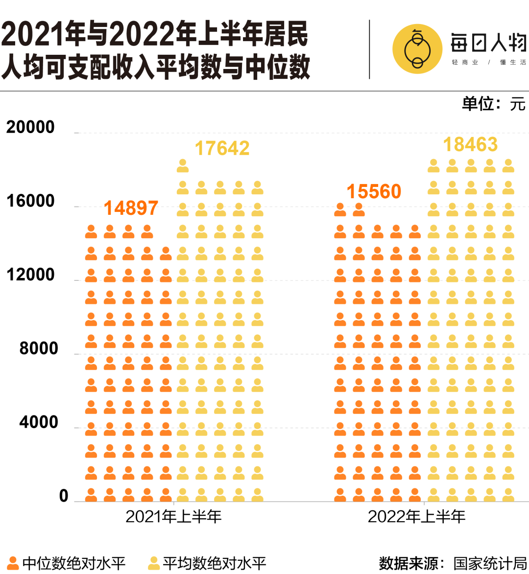 2021年上半年,我国居民人均可支配收入中位数是14897元。到了2022年上半年,这个数字缓慢上升到了15560元,平均到每月大约是2593元。