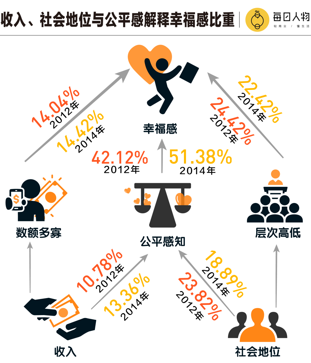 并且,对于收入达到一定层次的人来说,在达到某一个临界点后,收入的上升所带来的的幸福感会提升得更加缓慢。公平感知对幸福感的解释力度非常大,而且呈上升趋势。不患寡而患不均,对于很多人来说,可以接受工资高低的差异,但不能接受不公平分配导致的差异。在一项收入与幸福感关联度的研究中,研究者发现参加调查的人员中,更多人觉得在对幸福感的影响上,公平比绝对收入更大。