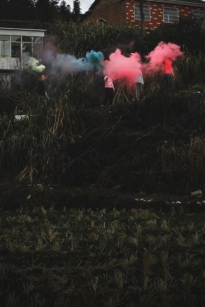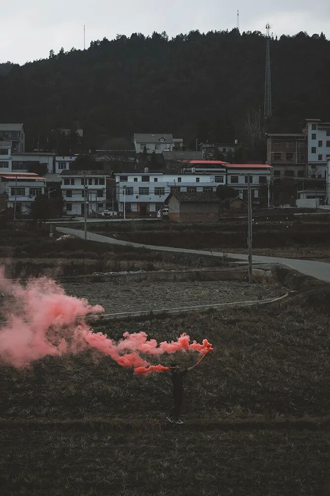 ▲ 杨婷在村边的⽥野间放彩烟,硫磺味道弥漫空中,成为⼀种“乡愁”。