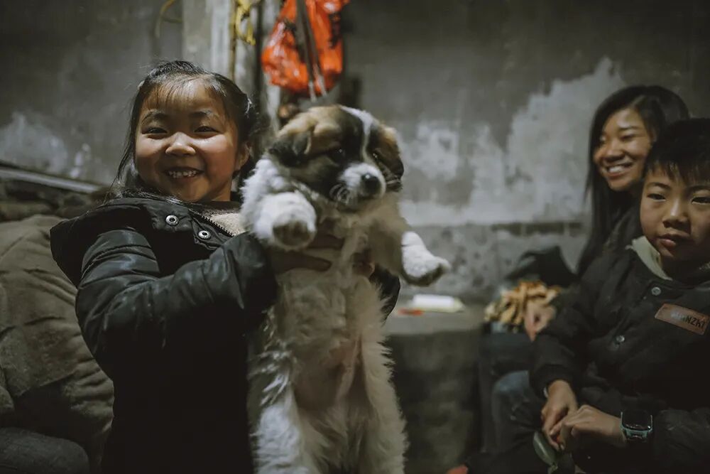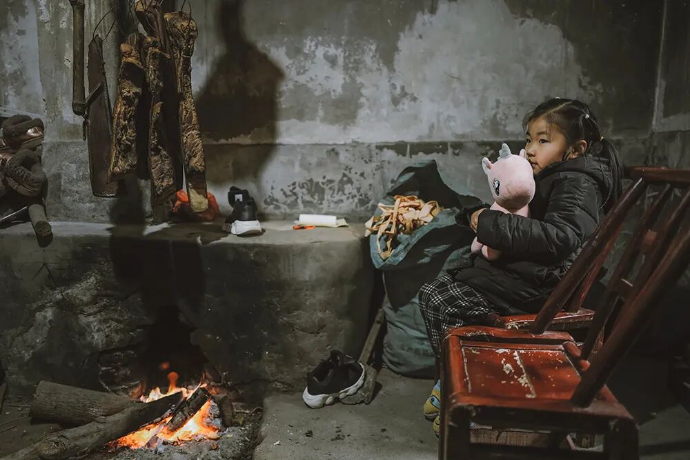 ▲ 在浏阳,家家有熏腊⾁的传统,杨婷的姐姐杨柳带着孩⼦在熏腊⾁的⽕塘边烤⽕,⼩⼥⼉抱着妈妈送她的圣诞 礼物,⼀只叫“蛋仔”的⼩狗。