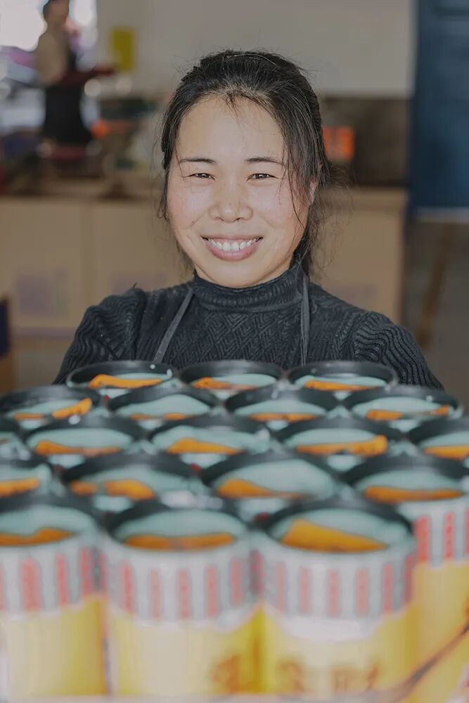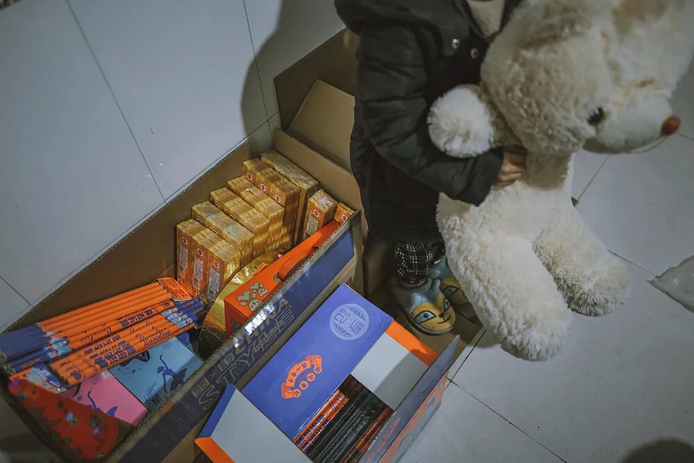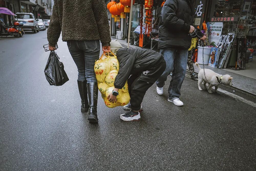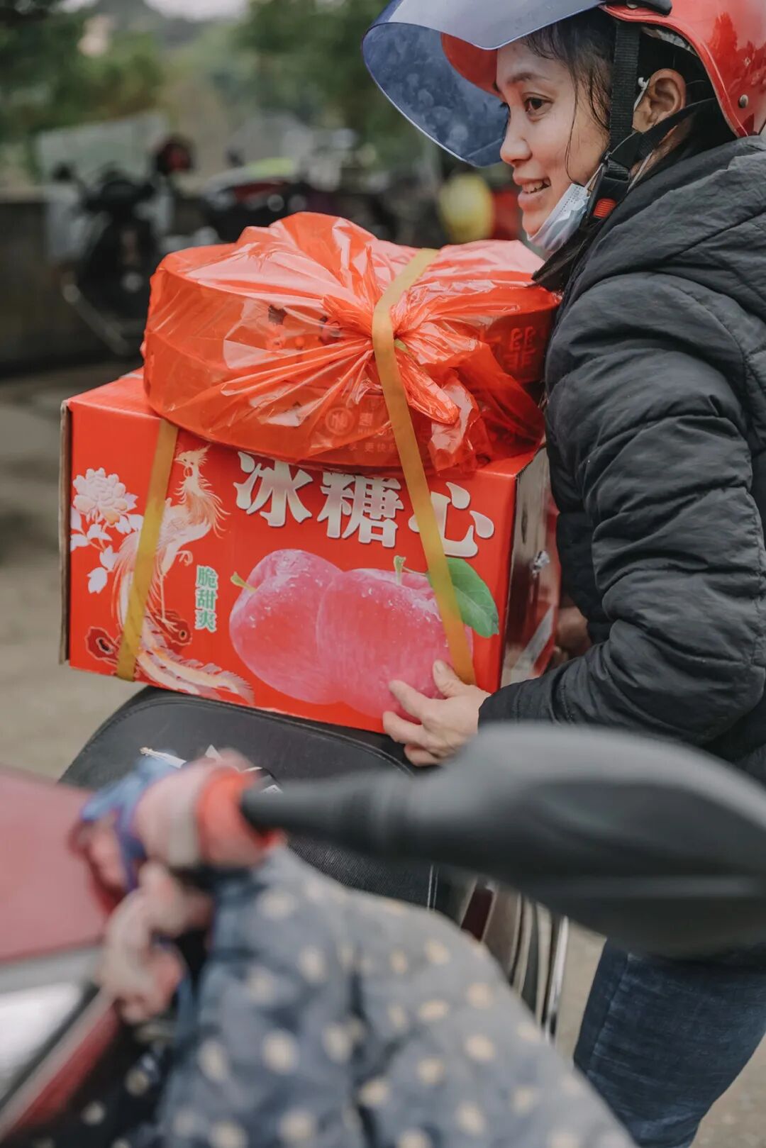 ▲快过年了,烟花⼚的⼯⼈拿着⼚⾥发的年货(⼀箱苹果、两挂鞭炮)准备回家。