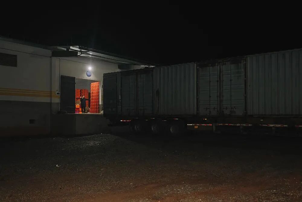 ▲ ⼊夜的烟花⼚仓库,运输卡⻋仍旧进出不断,把各个品种的烟花运往东北、内蒙、陕⻄等地。