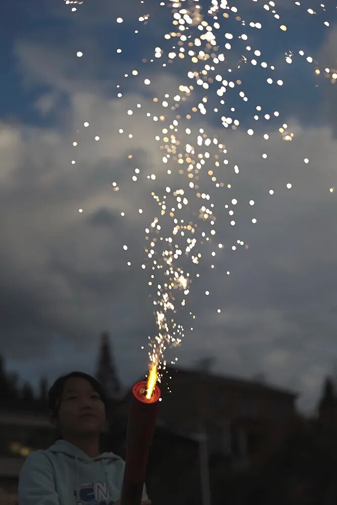 杨婷最喜欢落叶烟花,打上天空,像树叶一样零落,也像瀑布洒垂下来。她毫无抵抗,一定要看着花火渐渐消失在黑夜里。不过那一晚,“到处都是烟花,礼花挤在空中,都看不太清每朵烟花的样子了”。