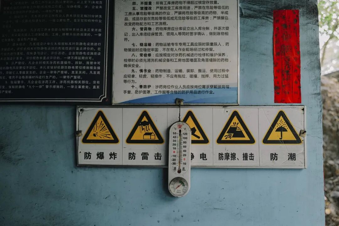 ▲ 烟花⽣产是⾼⻛险⾏业,安全是每个⼯⼚需要不断提及的重中之重,⻋间外墙粉刷成不同颜⾊进⾏⻛险等级区分,每个⻋间也会严格限制进出⼈数。