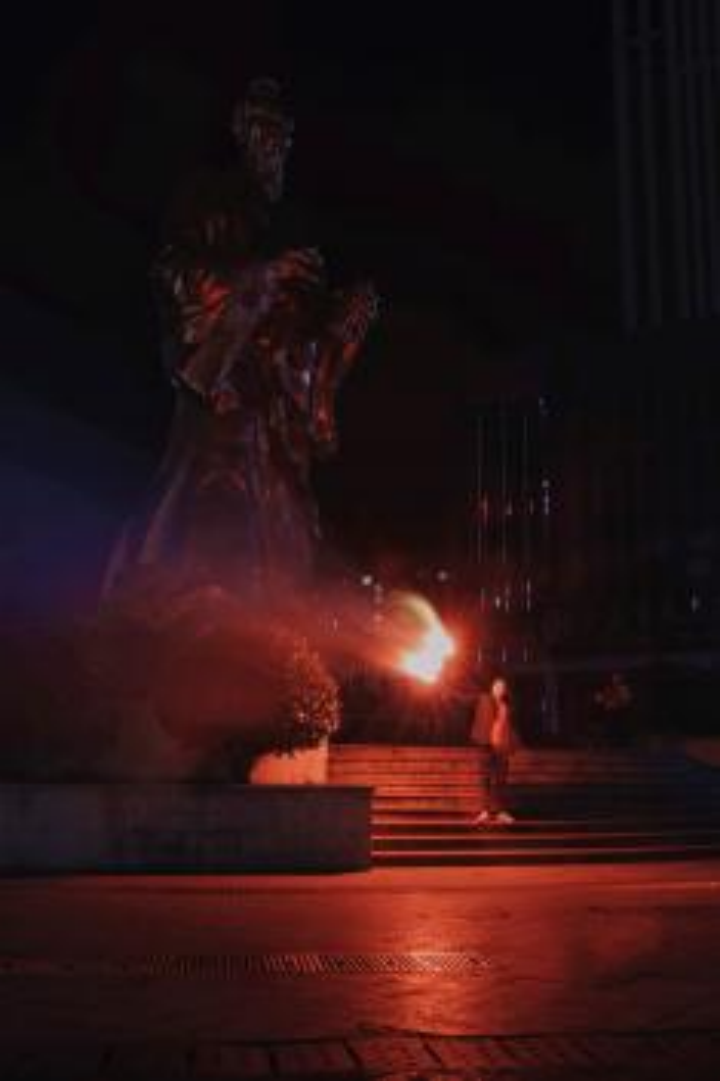 ▲ ⼈们在被誉为中国花炮祖师的李畋雕像前燃放烟⽕。