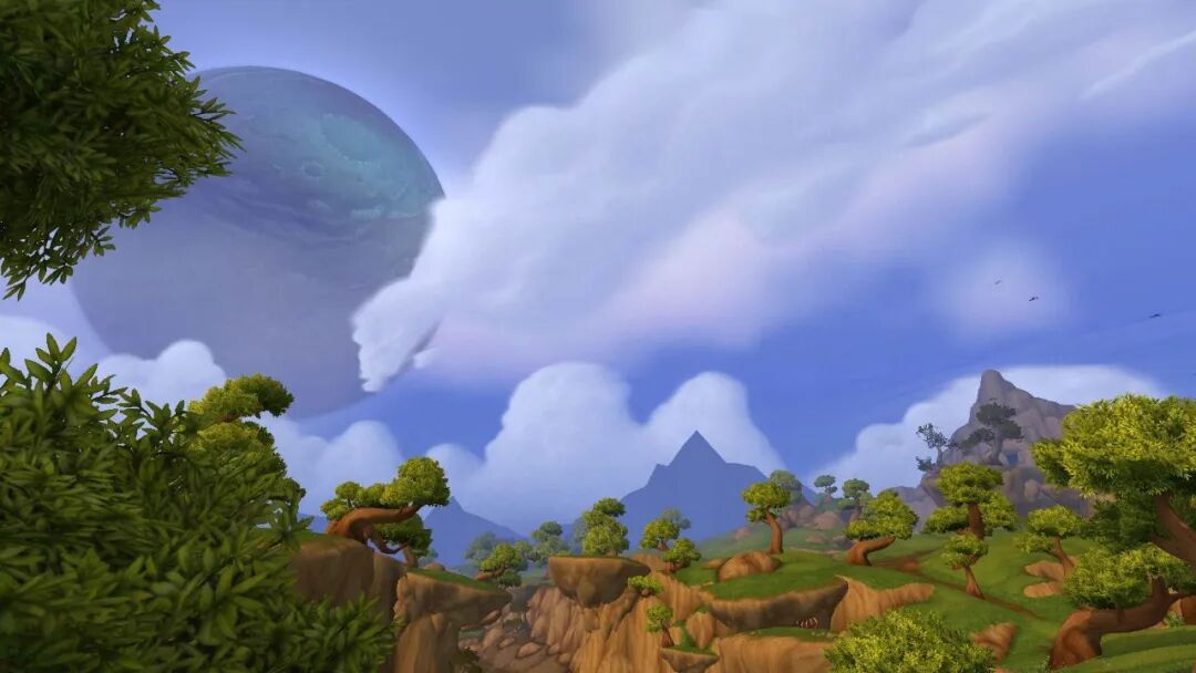 他最常去的地方之一,是纳格兰草原,一个人静静地看会风景。纳格兰在兽人语中的意思是“风之地”,地图配乐也有萧萧风声。这里有青绿色的草原,巨大的石头阵,漫山遍野的小动物,悬浮的山体像极了《阿凡达》里的哈利路亚山。