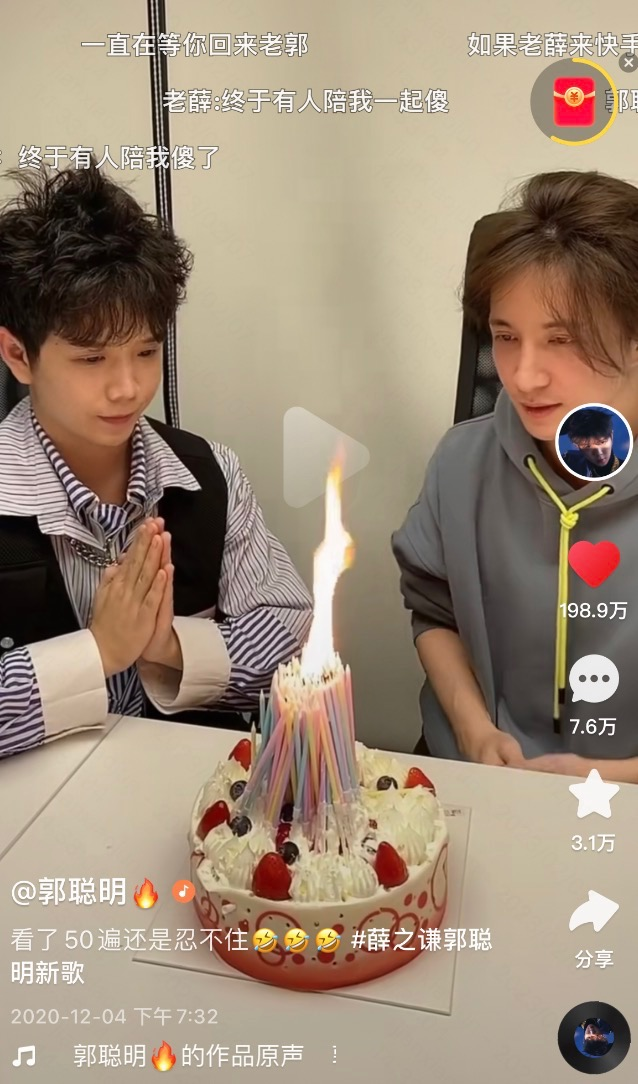 郭聪明崇拜薛之谦,这不是什么秘密。在他的快手主页,两条置顶的视频都跟薛之谦有关,一条是两人合作的歌曲,另一条是薛之谦给郭聪明过生日的搞笑视频。