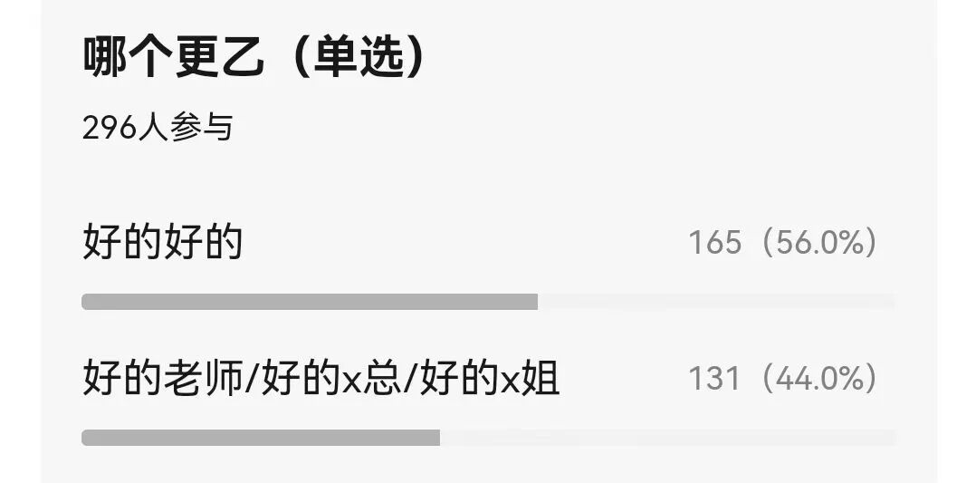 一个简单的“好的”“收到”“辛苦”,太过生硬、干瘪,学过乙学的乙方,懂得将词组重复说上两次,像是“好的好的”“辛苦辛苦”“感谢感谢”和“您忙您忙”……一下子变得既诚恳,又柔软。