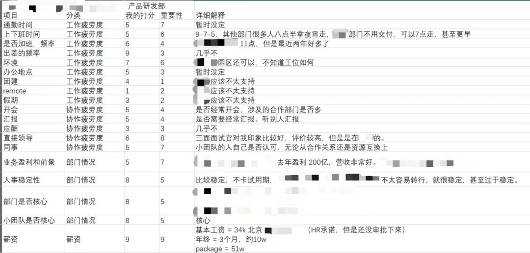为了最大限度地消除不安,他把进入了决赛圈的四份工作,放到一个Excel表里比较,按薪资、部门、疲劳度等等,进行了全方位的打分。