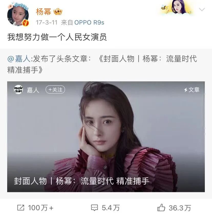 也许在外界看来,坐拥1.1亿微博粉丝的“流量女王”和“人民艺术女演员”,很难是同一个人。但2018年,在完成嘉行传媒的业绩对赌之后,“好演员”一词就频繁出现在杨幂口中。
