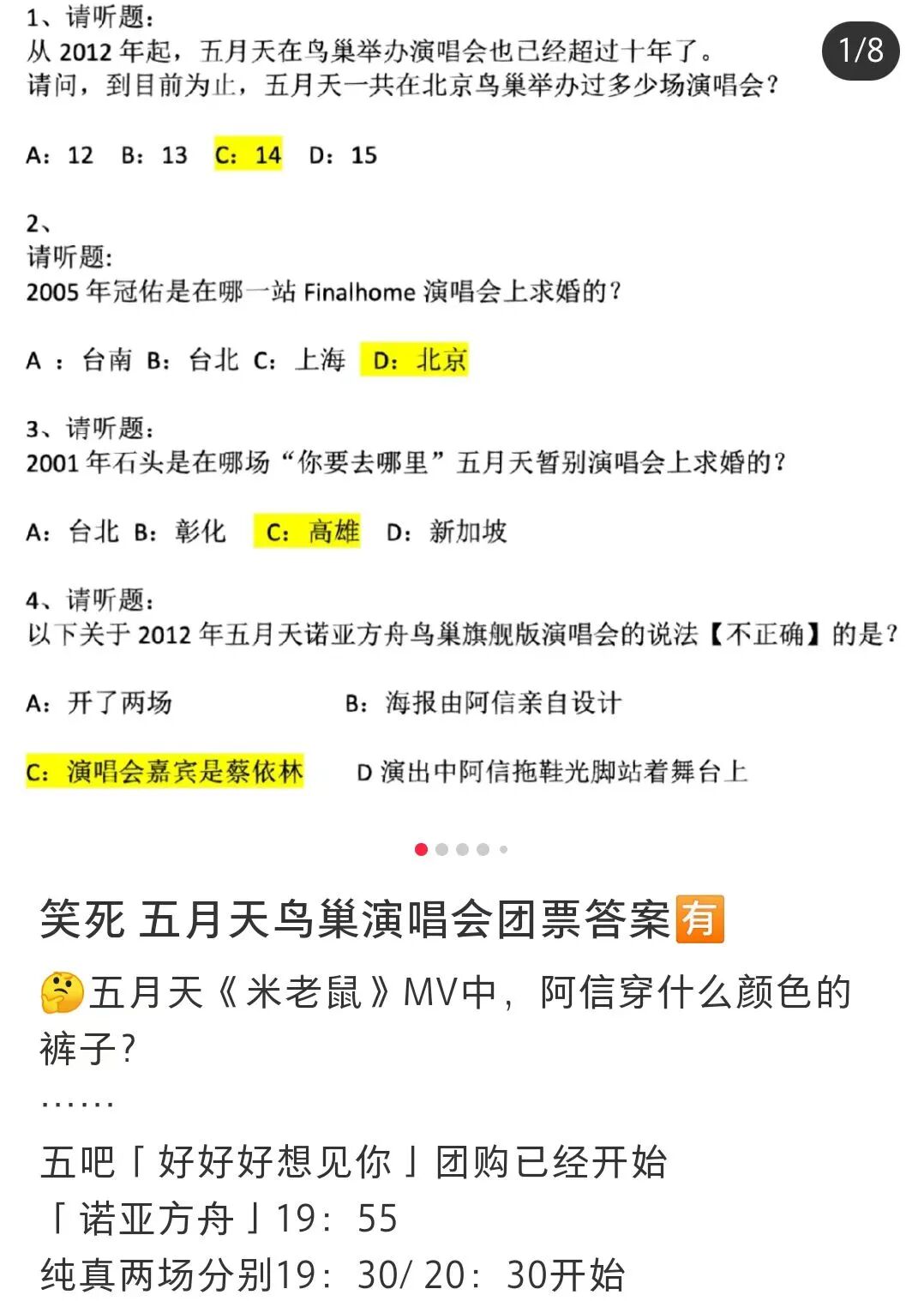 如此浓烈的热情,让获得入场券的难度呈指数级上涨。5月6日,在面向大众的门票开售之前,五月天的粉丝群率先开启了团票——这是特供粉丝的福利,数量不多,需要提前通过考试才有资格购买。郭灵下场体验后得出的结论是:在今年,团票答题的参与者太多了,想搞到票,答题正确率必须100%。