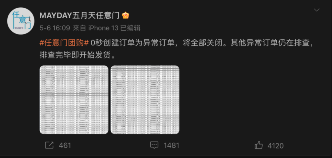 粉丝们觉得,黄牛是造成这场票荒的关键。就在几天前,五月天歌迷和黄牛之间爆发了一场正面冲突。5月6日,郭灵参加的那场团票考试结束之后,团票组织者、三大粉丝团之一的“MAYDAY五月天任意门”发现,团票过程中出现大量黄牛代拍,随后在微博上发出异常订单截图:“0秒创建订单为异常订单,将全部关闭。其他异常订单仍在排查,排查完毕即开始发货。”