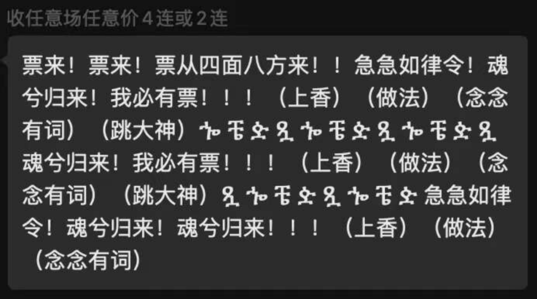 但即便是提前摇人、做题、蹲守,也无法带来绝对的保障。到最后,各种“发疯文学”开始冒头。年轻人开始求助玄学,曾经用来“求财”的话术,出现了抢票限定版本,“我爱票,票爱我,票从四面八方来,时时刻刻来,铺天盖地来”。有网友说,这种紧张且全凭命运支配的心情,让人梦回当年的高考查分。