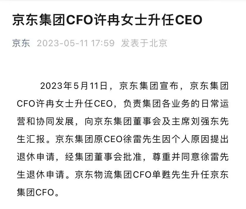 5月11日,京东发布了一则管理层变动公告:现任CFO许冉将接替徐雷,担任京东集团CEO兼执行董事。