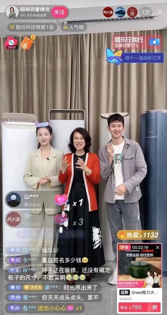 只是,这些被董明珠给予了厚望的第二增长线业务,全部是她自己上阵的,没有出现孟羽童的身影,孟羽童能做的,还是充当一个格力背景板“主播”。