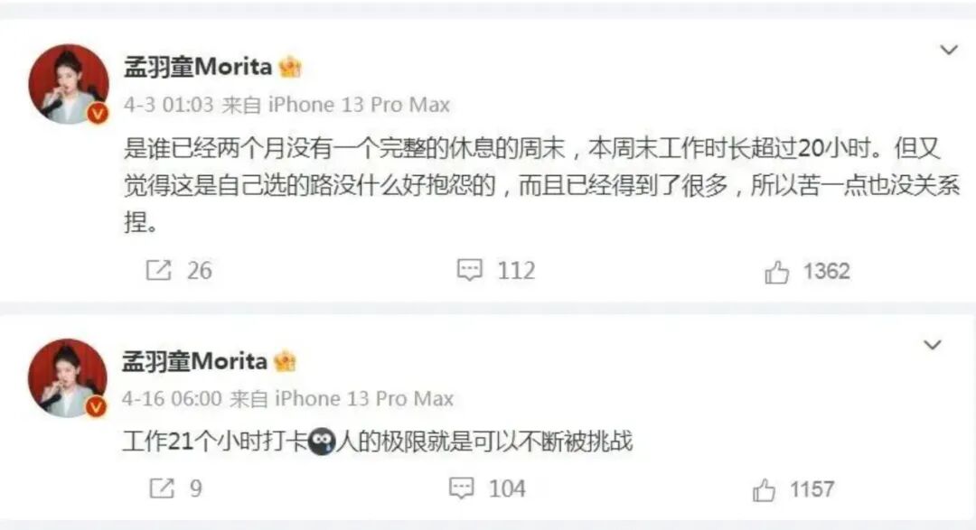 但CP解绑,怎么会如此简单,很快,网友挖出了孟羽童曾经的“小抱怨”。就职格力期间,孟羽童自称是个“劳模”,一度“两个月没有一个完整的休息周末”,也有过一天超过21个小时都在工作的极限经历。