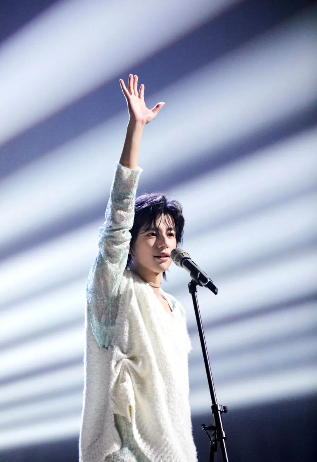 第二次公演的舞台上,邓典穿着白衬衫牛仔裤亮相。《水星记》前奏响起,他坐在半空中,唱着“还有多久才能跟你接近”。听完这首歌,同为选手的妙莎哭了,“他的舞台(给人)那种很孤单的感觉”。