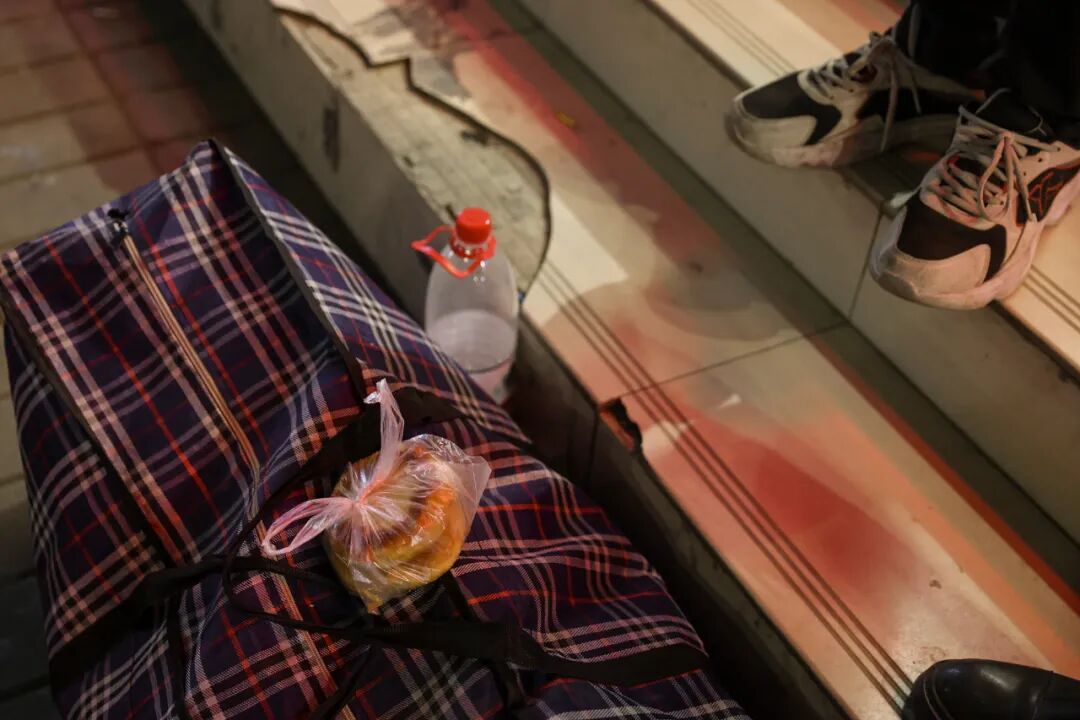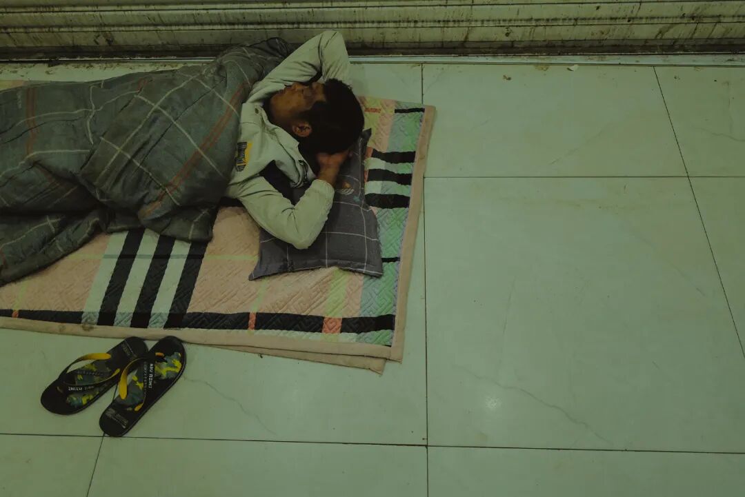 ▲ 晚上打地铺的男人,已经收拾好铺盖,准备新一天的工作。