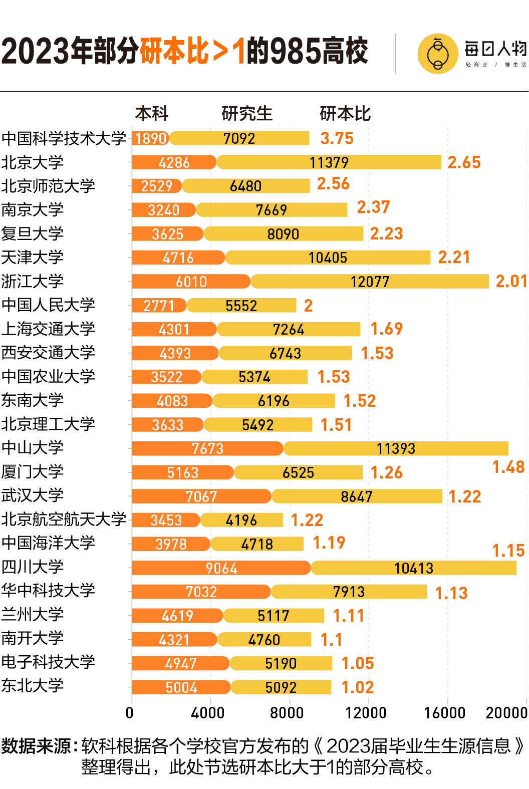 根据全国多所985高校的报告,毕业生里出现学历倒挂的高校,已经超过了20所。往北,北京大学、北京师范大学的研本比(研本比=研究生/本科生)均超过2.5,中国科技大学的研本比是3.75,在2023年度排到全国第一。但中科大也相对特殊,它从建校开始就着重培养硕士、博士人才,核心是培养尖端科技人才,一直以来都更加侧重于研究生教育,所以它的研本比算是一个特例。