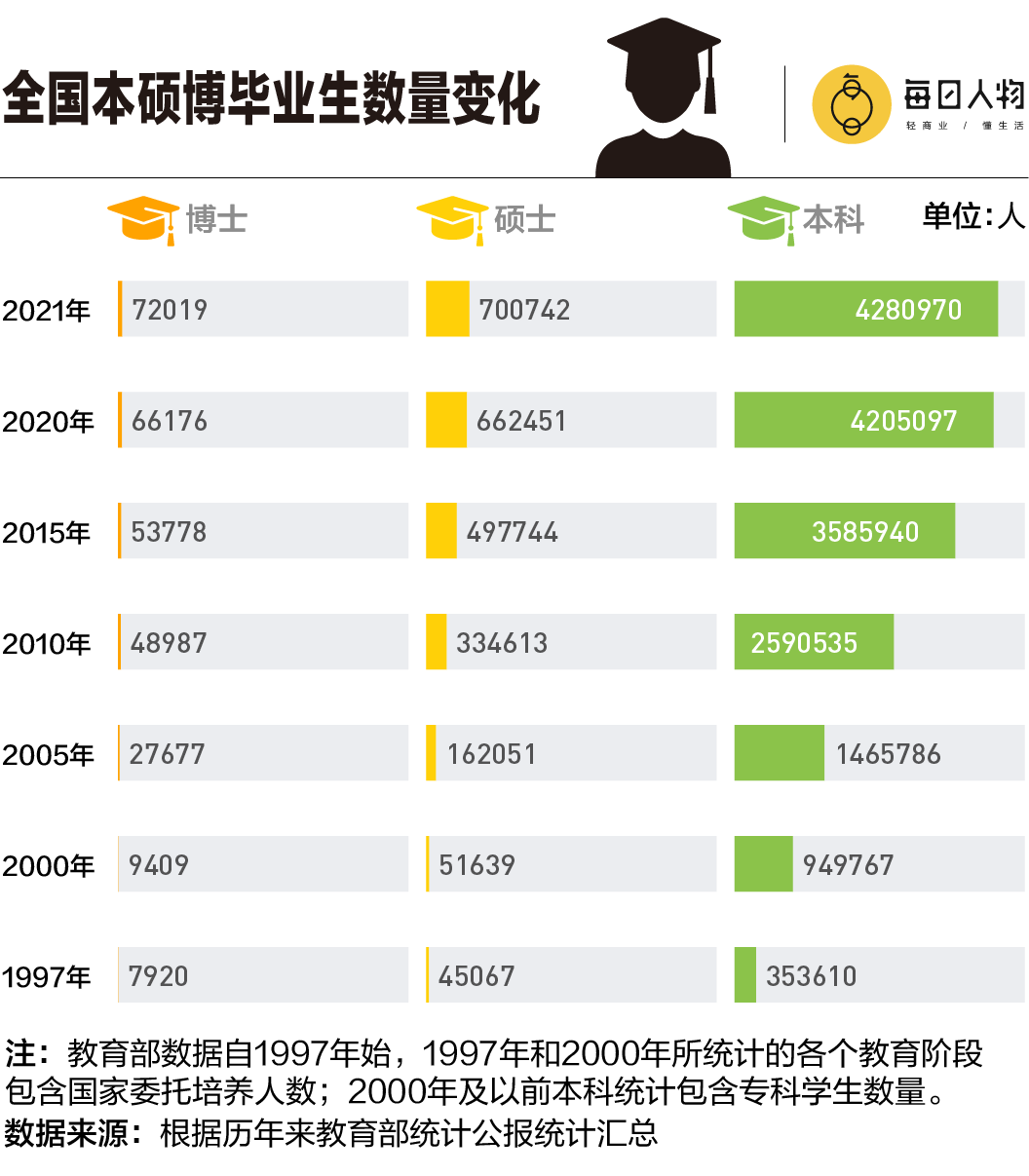 博士生数量的增长还算“矜持”,从1997年到2021年,增长了9倍左右,到2021年,全国的博士毕业生人数是7万左右。而本科生和硕士研究生的数量,可以说是蹭蹭“暴涨”,均增长了10倍不止。