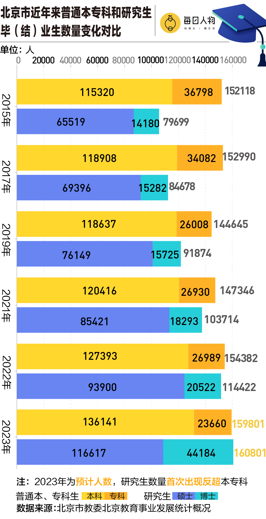 但今年春天,一个“北京硕博毕业生人数首超本科生”的话题打破了这样的幻想。最先爆出这个消息的是北京,北京市教委最新预测数据显示,北京市的硕博数量,未来整体将呈现“倒挂”趋势。