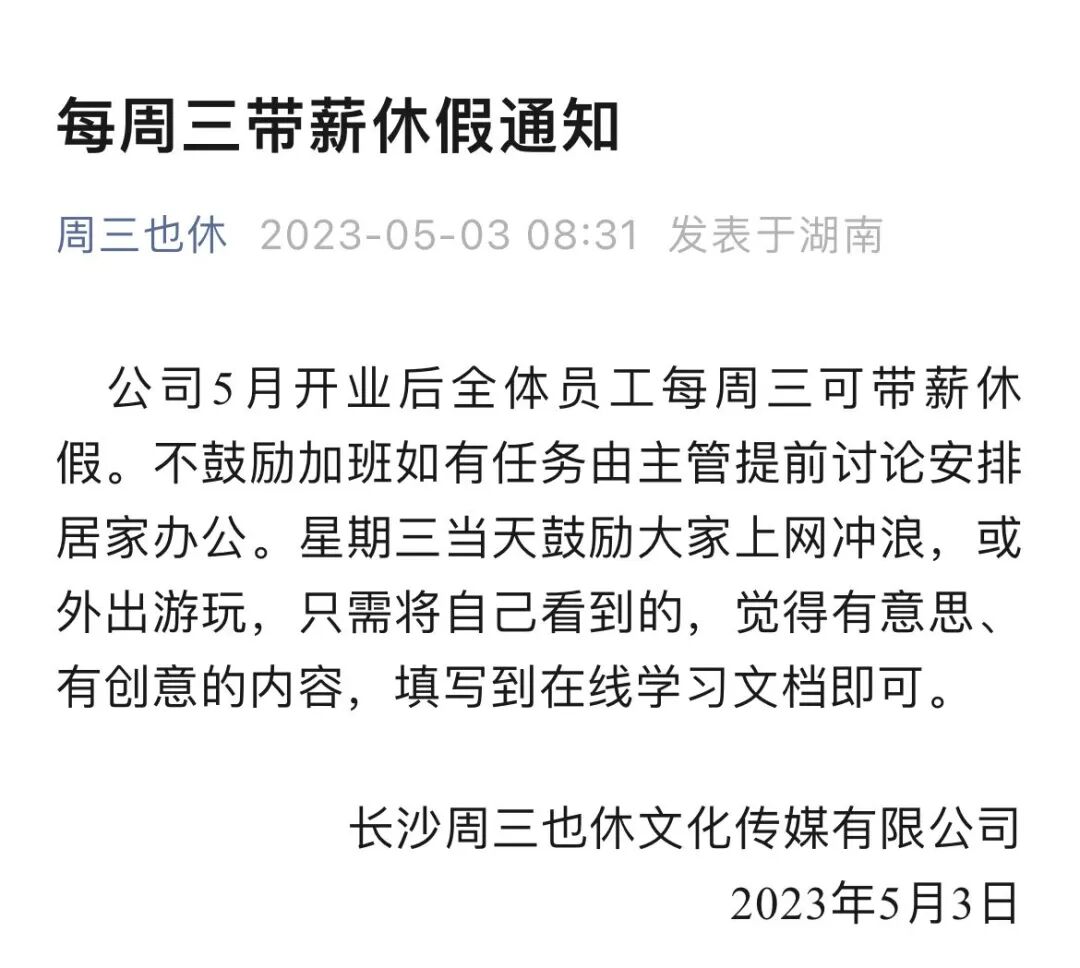 我的确有传播诉求。实际上,我们还是一家做内容的公司,需要去做一些尝试。否则,我就不会给公司取名字叫“周三也休”,不会在公众号去发布通知,在内部发不就好了?但我的确想让公众知道,我们正在做这样一件事。