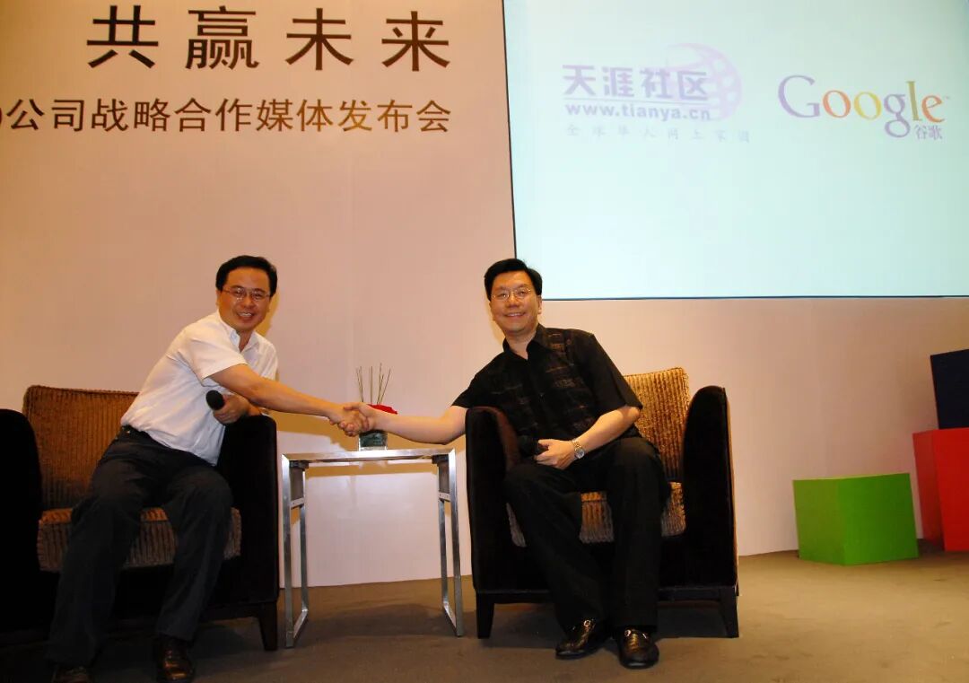 ▲ 2007年8月20日,谷歌联手天涯推出“天涯问答” 共同“抗击”百度“知道”,邢明(左)与李开复。图 / 视觉中国