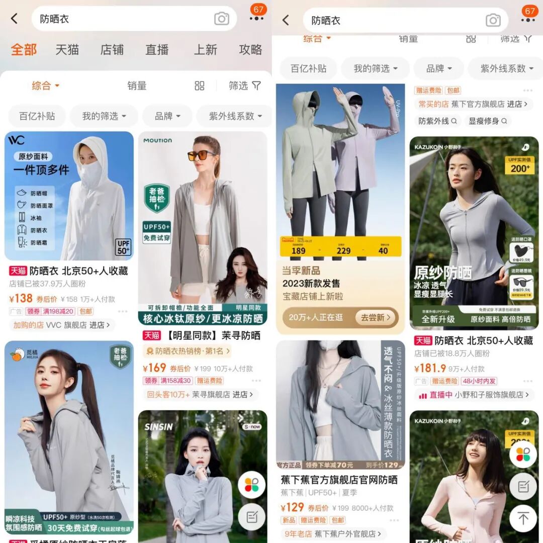 早在前两年,从2021年开始,“硬防晒”就成了网络热词,当年天猫的硬防晒市场规模已经达到了270亿元。在今年入春以后,防晒衣在网购平台的搜索量一直持续上升,激增了110%。